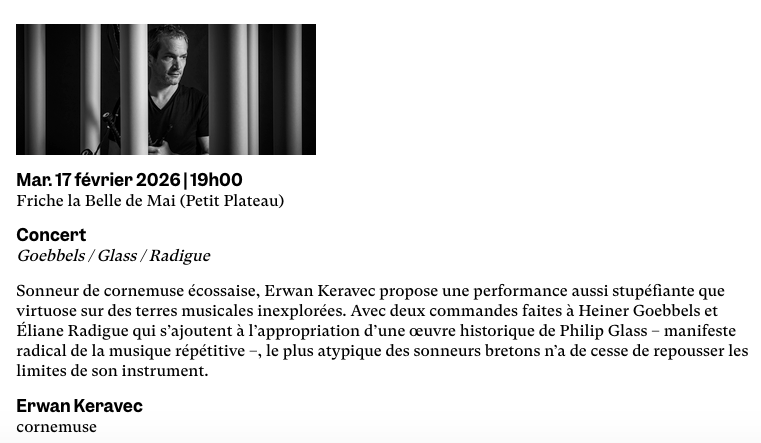 Mardi soir, concert (archi comble!) au GMEM, que j’attendais impatiemment : de la cornemuse version contemporaine, yes!!!