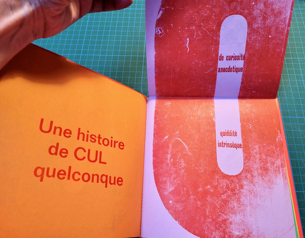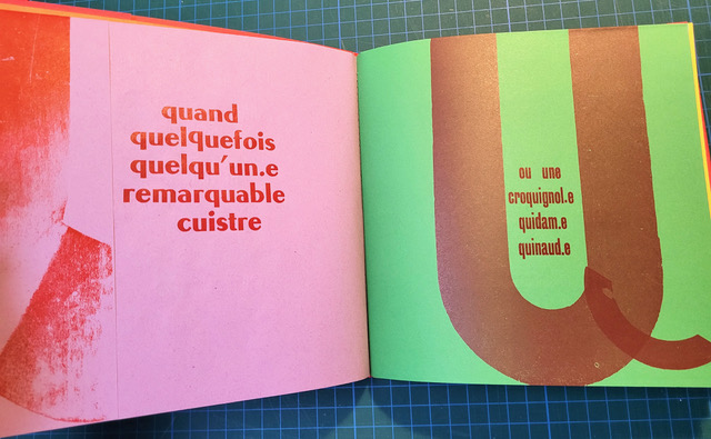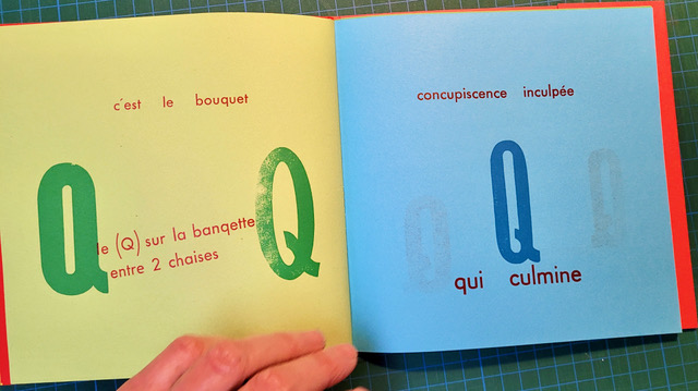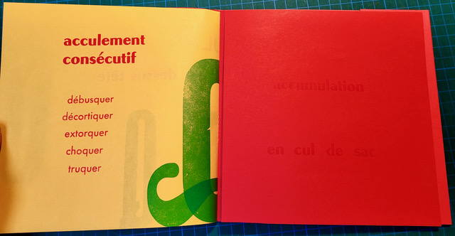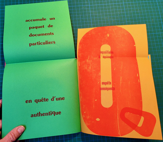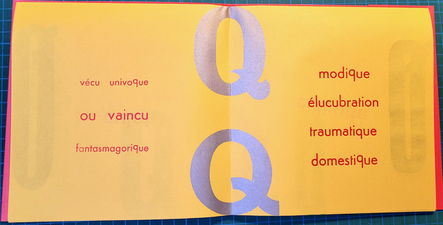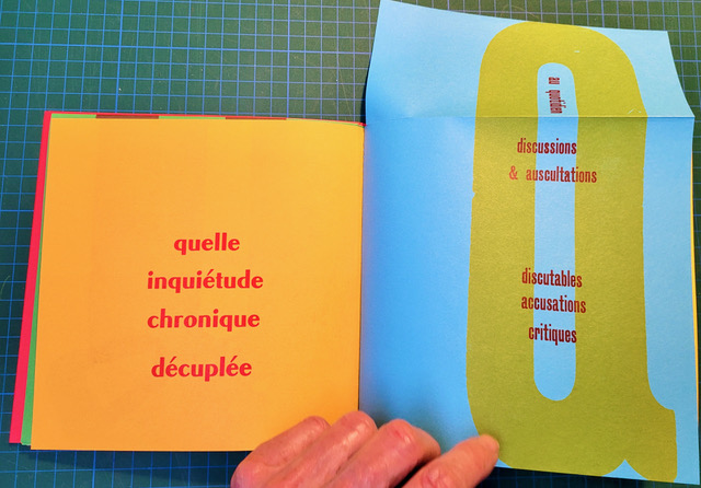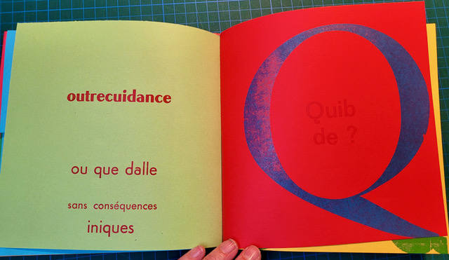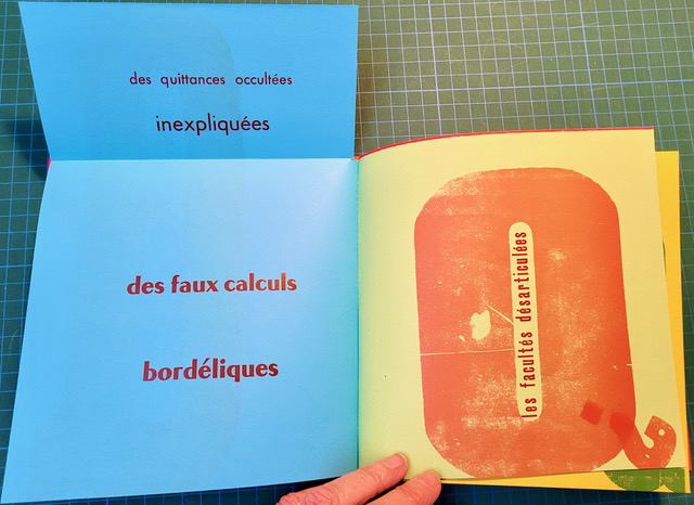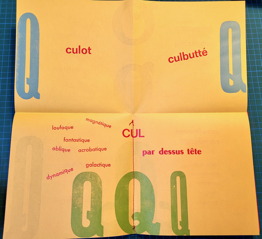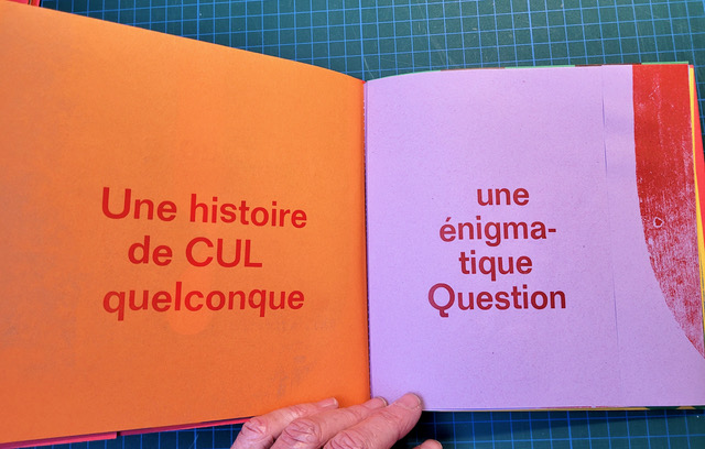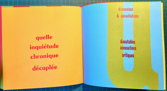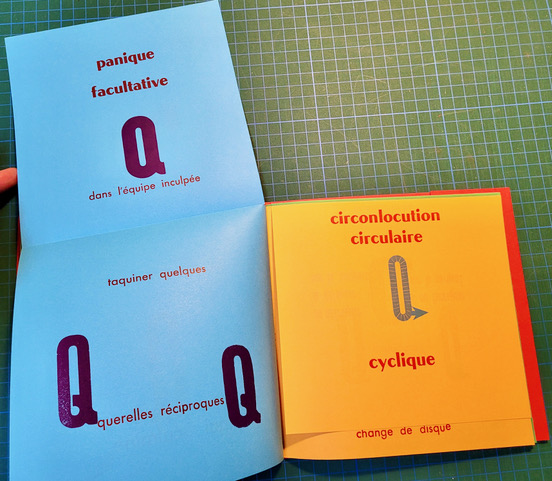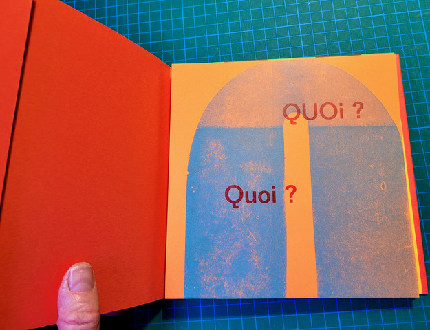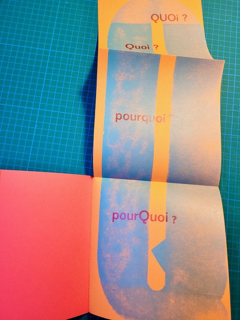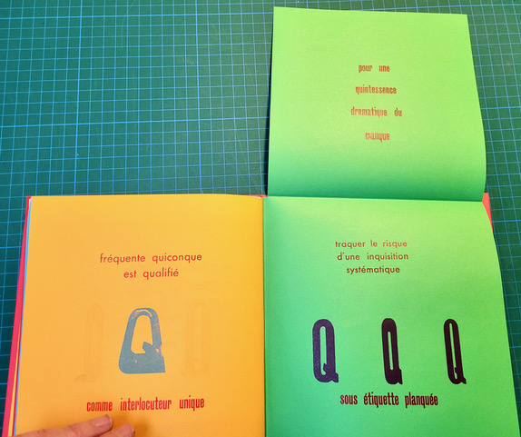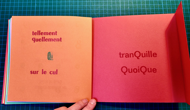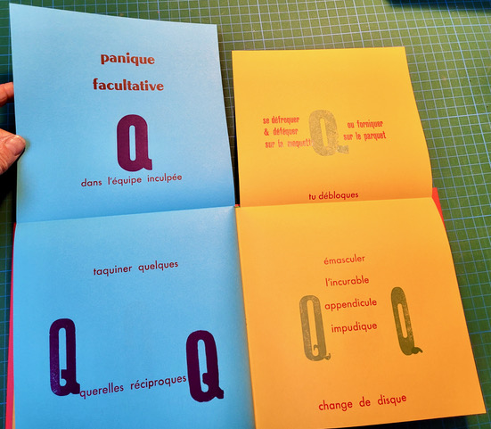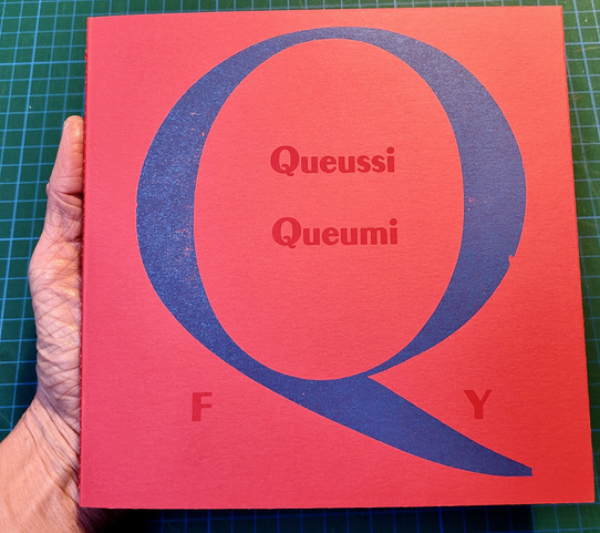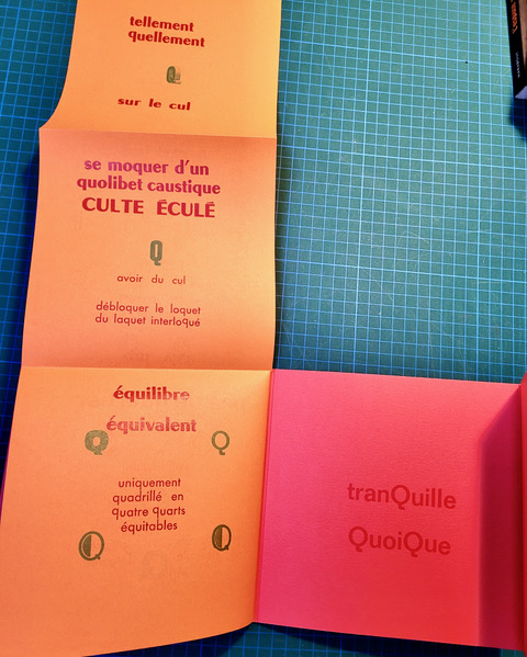 QUEUSSI-QUEUMI – édition des petits livres – décembre 2025 – 18,5 cm X 18,3 cm – 32 pages qui se déplient – imprimé en typo sur papiers couleurs – couverture Keaykolour 300g — cousu de fil rouge – 50 ex. différents – 45 euros